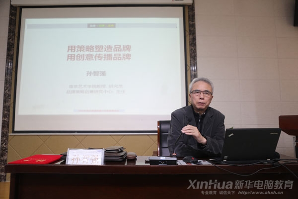 安徽新华电脑专修学院特邀南京艺术学院教授孙智强先生在学院五号楼一楼的学术报告厅,举办了关于“用策略塑造品牌,用创意传播品牌”的学术讲座。