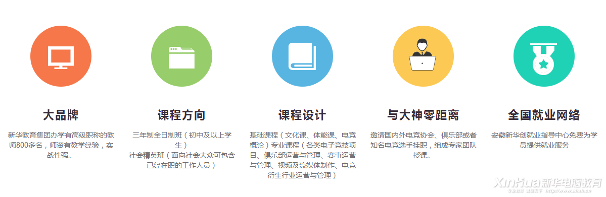 以安徽新华电脑专修学院预开设的电子竞技专业为例,该专业的教学初步规划分为五个阶段:第一阶段为基础教育,内容包括计算机操作基础、计算机组装与维护、音乐(上)、语文(上)、英语(上)、体育(上)、职业素质课等;第二阶段为电子竞技管理阶段,内容包括游戏制作基础、电子竞技理论知识、电子竞技俱乐部运营及管理、电子竞技赛事运营及管理、音乐(下)、语文(下)、英语(下)、体育(下)、普通话语音与播音发声、竞技解说和评判实践等;第三阶段为电子竞技项目实操,内容包括游戏制作高级、电子竞技项目理论知识、MOBA类电子竞技项目、RTS类电子竞技项目、FPS类电子竞技项目、卡牌类电子竞技项目、竞技运动员实践、职业素质课;第四阶段为创客实训,内容包括电子竞技相关衍生产业、主播、解说、淘宝创客、商业广告设计、淘宝平台开店营业、淘宝全案营销、主播实践等;第五阶段为竞技综合实践,内容包括游戏视频和音频制作、premiere影视作品剪辑、After Effects影视级视觉特效、影视音频音效制作、节目创意与制作、线上综合竞技实训等。以兴趣为导向,以爱好为动力,督促学生在学习中找到自己的闪光点。