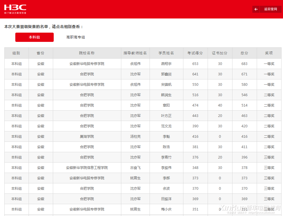 本科组的晋级名单中,安徽新华电脑专修学院的燕翔宇和宋镇帆分别683和580的分数拿下一等奖,李郝和梅小庆分别以373和351的分数拿下三等奖。