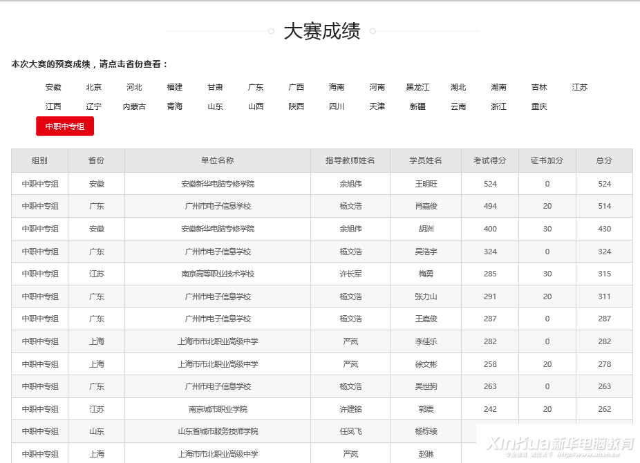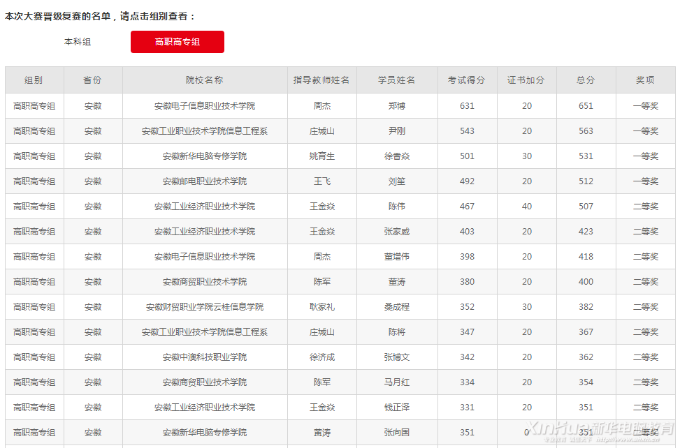 高职高专组的晋级名单中,徐香焱以531的分数拿下一等奖,张向国以351的分数拿下二等奖。