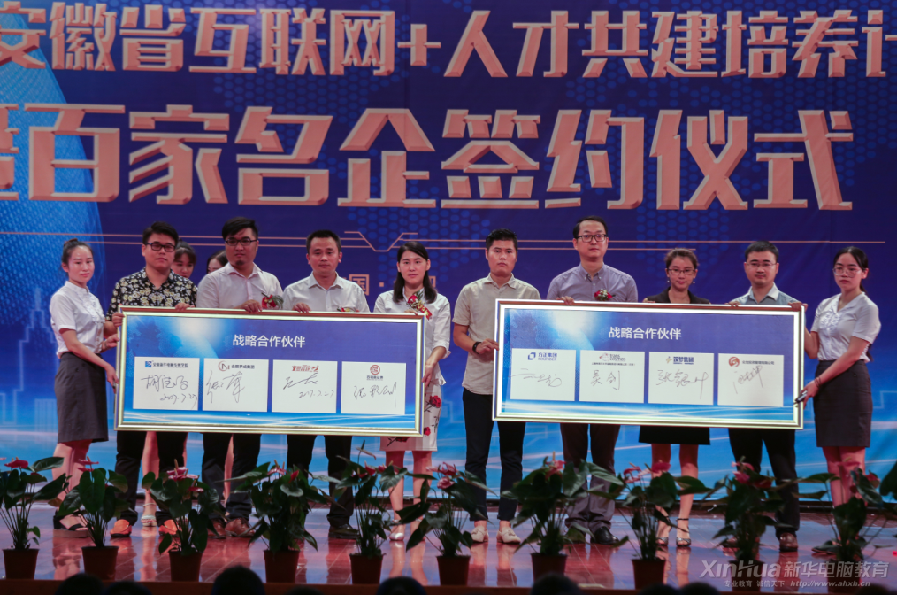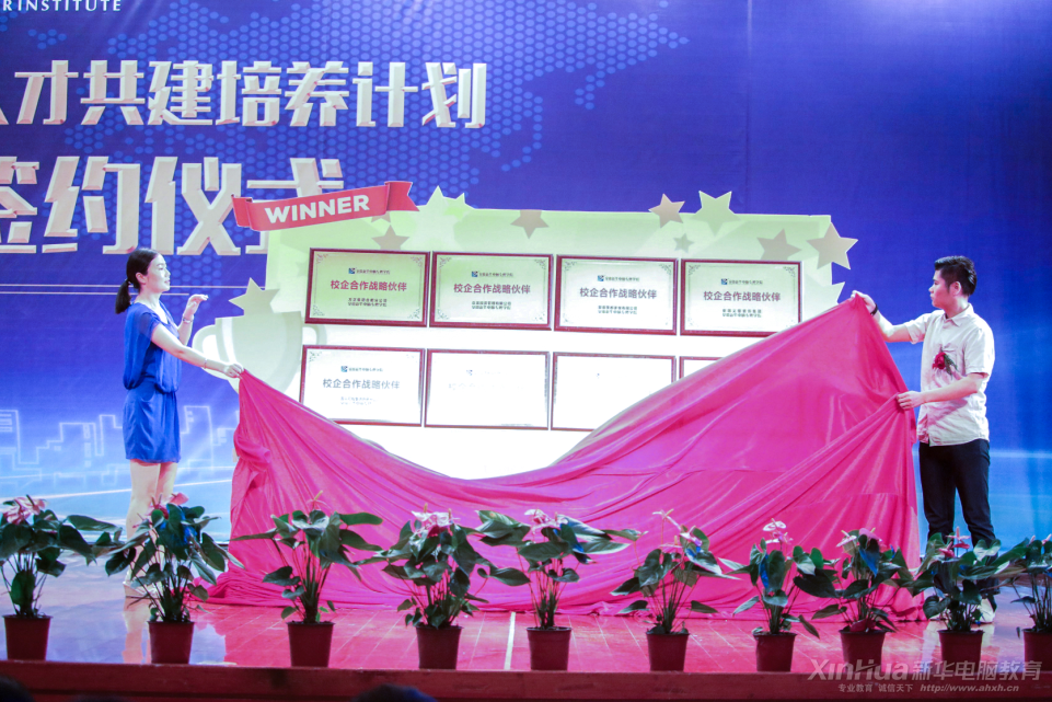 安徽新华电脑专修学院院长助理胡德俊与企业代表上台签约