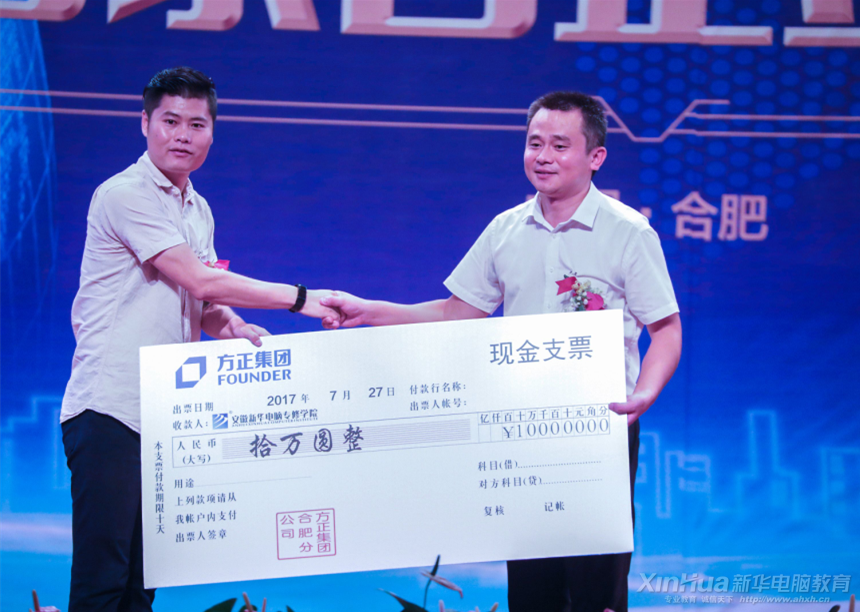 安徽新华电脑专修学院院长助理仇洋、方正宽带网络服务有限公司刘生龙上台揭牌