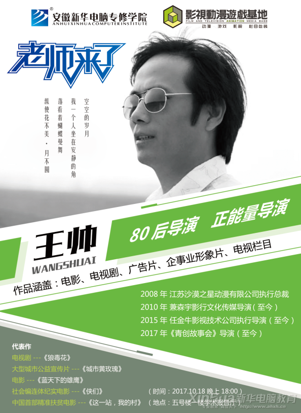 本次大咖讲座将于2017年10月18日晚上18:00在安徽新华电脑专修学院五号楼一楼学术报告厅强势开启。先沿的专业知识,一流水平的艺术创作等你来学习。