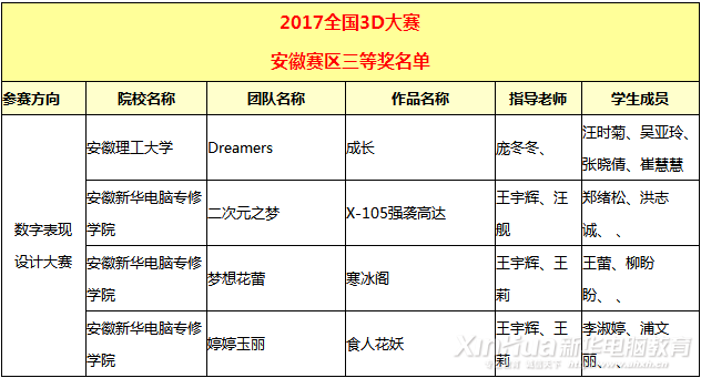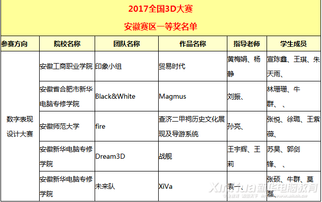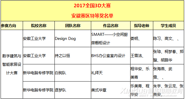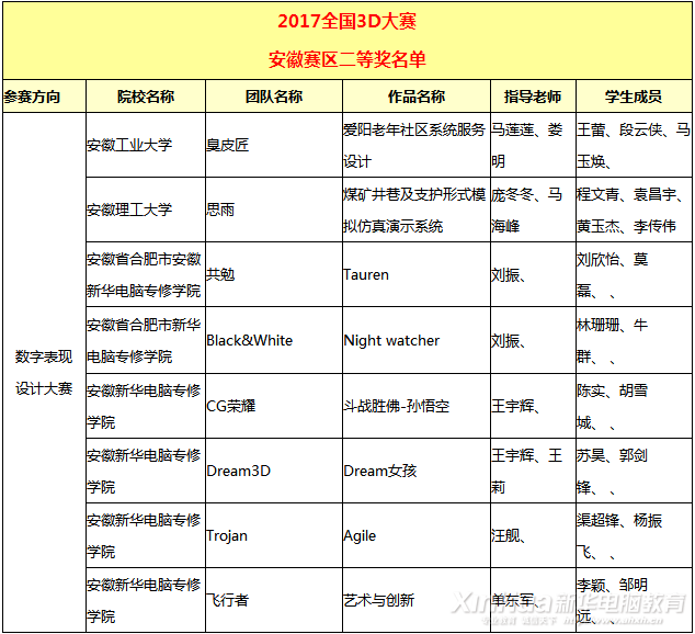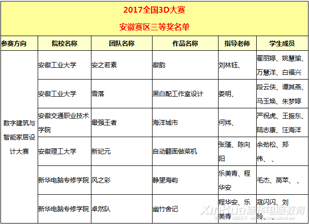 3D动力网“2017第十届全国三维数字化创新设计大赛”官网刊登公告消息,安徽新华电脑专修学院在2017全国3D大赛安徽赛区中闪亮出彩,一举拿下众多奖项。程华安、乐美菁老师指导的白驹队、逐梦队分别以《礼拜天》《美式华章》两个作品摘得了数字建筑与智能家居设计方向的特等奖;数字表现设计方向的一等奖更是几乎被安徽新华的师生们包揽,除此之外,参赛的学院学子们在其他方向的比赛中也展现出了高素质的技术水平和技能水准。下面,一起去看看安徽新华的学子和老师们的战绩吧!