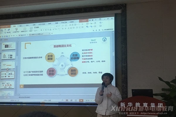 圣都公司对于安徽新华电脑学院的学生来说并不是个陌生的企业,在学校里也有着圣都班的同学,圣都公司是有着较全面的直营体系市场格局,而其本身也是一个拥有优秀企业文化的公司。在现场招聘人员播放了几条宣传企业文化的视频,无一不体现出圣都公司其凝聚在一起的团结力和创造力,而在现场的同学们也被这像大家庭一样的氛围深深吸引着。