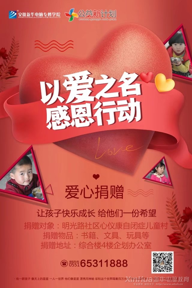 一个个爱心从人群里凝聚,一张张笑脸也会在孩子们的脸上绽放。在你享受春天的甜美时,总是有人在刺骨的寒冬,他们有时只是需要一个小小帮助,亲切的拥抱和温暖的笑容,让我们献出自己的爱心,给那些孩子们送去属于自己的温暖吧。安徽新华电脑专修学院致力于培养多方面优秀人才,在学历加技术的基础上更加注重个人素质和成人功德上的培养,做到让在校学子先成人再成才,从而学会在社会上更好的发挥自己的光与热。从而做到技术上的强者,人格上的精英者。