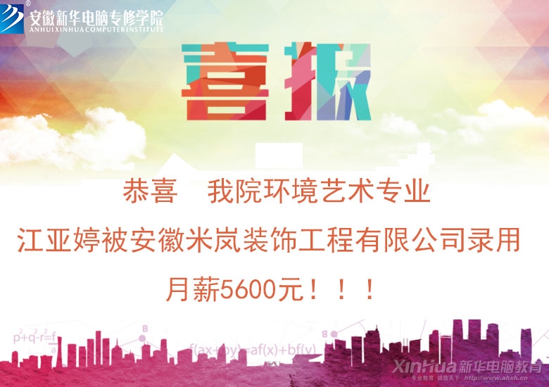 恭喜我院环境艺术专业江亚婷同学被安徽米岚装饰工程有限公司录用,月薪5600元!!!