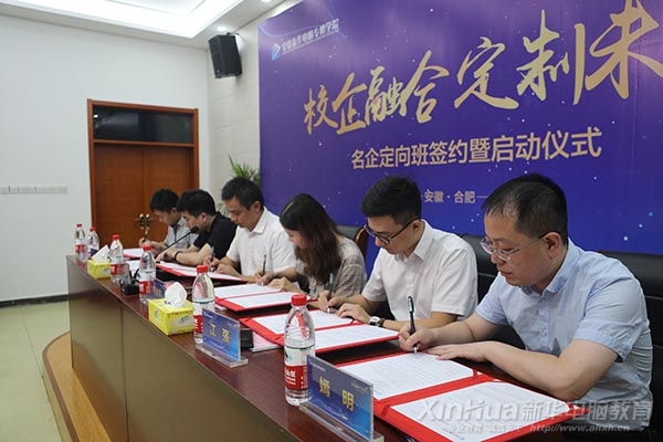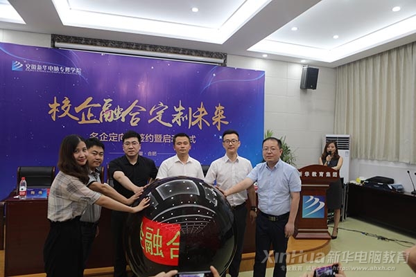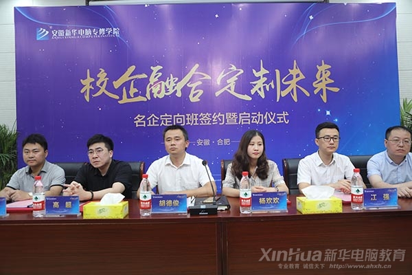 安徽新华电脑专修学院在五号楼一楼学术报告厅隆重举行“校企融合、定制未来”名企定向班签约暨启动仪式。