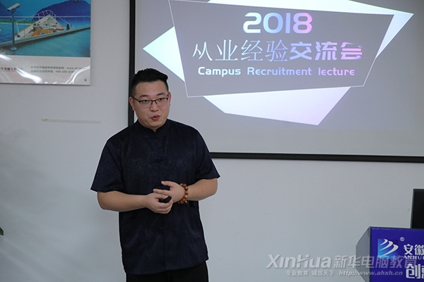 安徽新华电脑专修学院创就业指导中心学生就业指导课面授厅。学院14年电子商务专业毕业的杰出校友杨志龙给学弟学妹们分享自己的就业、创业经历。