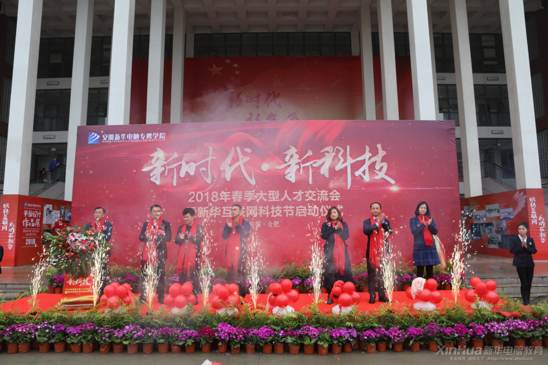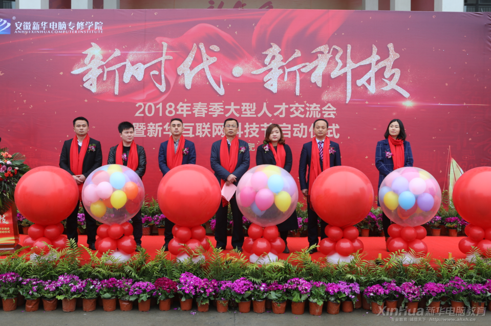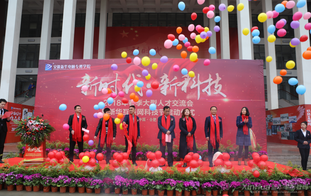 今天,在举办2018年春季大型人才交流会的同时,我们也迎来2018年新华科技节的开幕,本次新华科技节由安徽省科学技术协会、合肥市科学技术协会指导,新华互联网科技、安徽新华电脑专修学院共同主办,凤凰网安徽、北科传媒联合协办,活动将持续一个月的时间。而2018新华科技节首场活动“智趣嘉年华,科技酷品展”将于3月3日至12日在安徽新华电脑专修学院举行。在热闹欢腾的气氛中,主席台领导一起完成了2018新华互联网科技节的启动仪式,彩球纷飞,烟花绽放,也放飞了全体新华人的科技梦。