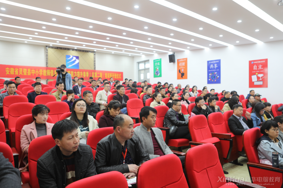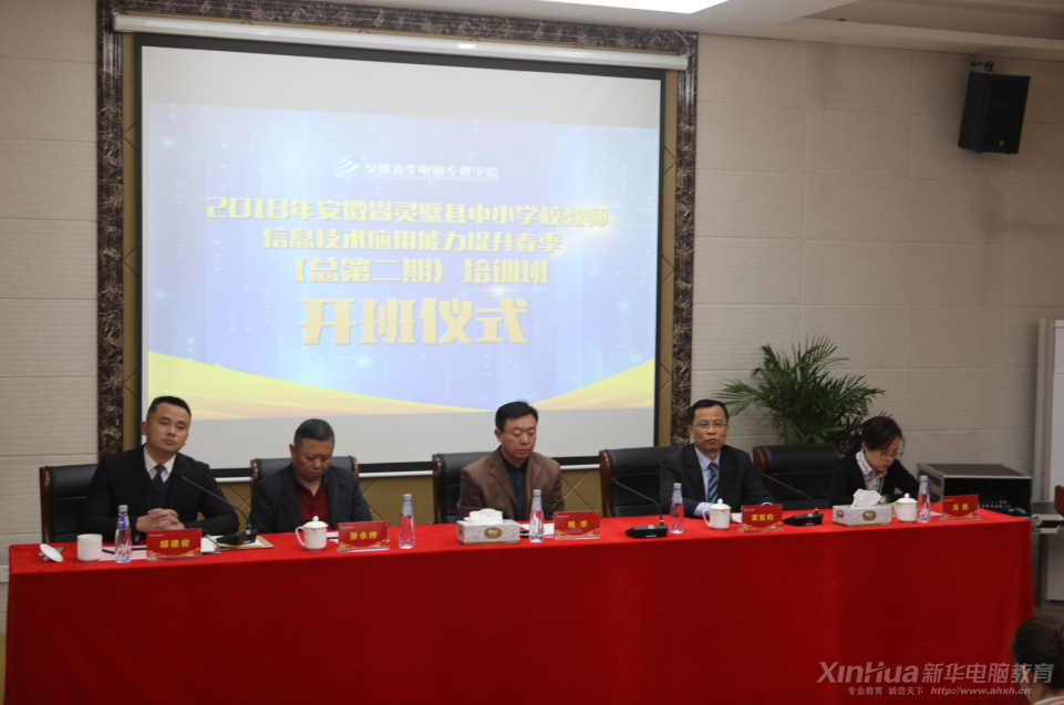 3月26日上午,安徽省灵璧县中小学校教师信息技术应用能力提升第二期培训班开班仪式在安徽新华电脑专修学院多媒体教室顺利举行。安徽省灵璧县教育体育局副局长姚华、安徽新华电脑专修学院院长束凯钧、安徽省灵璧县教育体育局电教中心主任张永持、安徽省灵璧县教育体育局冯枫老师、安徽新华电脑专修学院院长助理胡德俊等领导出席了本次开班仪式。