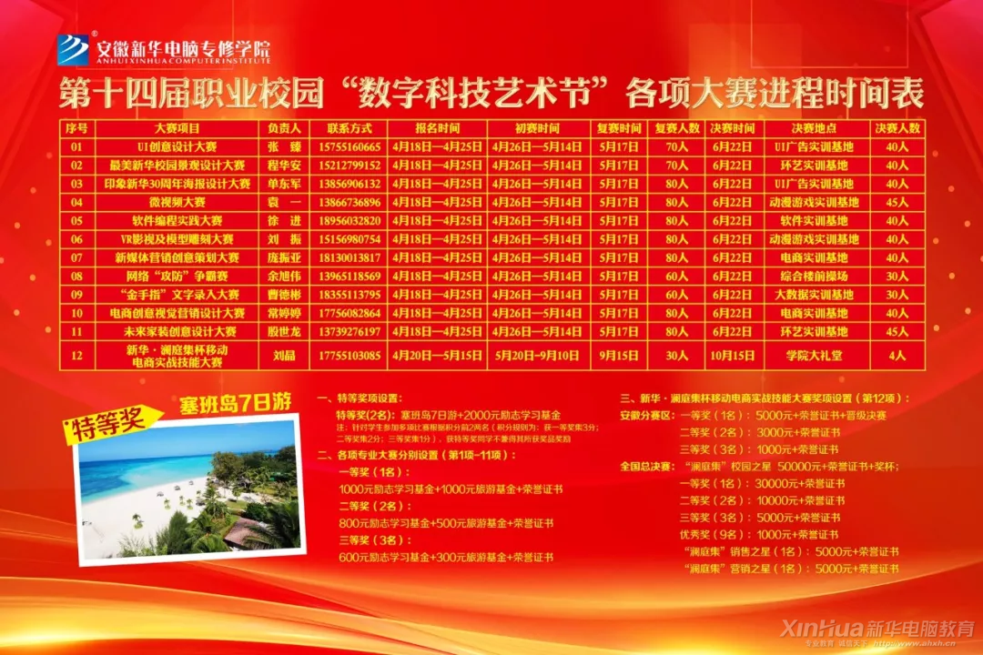 为期三个月的活动中,共计有“VR影视及模型雕刻大赛”、“新媒体营销创意策划大赛”、“UI创意设计大赛”、“最美新华校园景观设计大赛”、“印象新华30周年海报设计大赛”“微视频大赛”“软件编程实践大赛”“网络攻防争霸赛”“指舞飞扬文字录入大赛”“电商创意视觉营销设计大赛”“未来创意教室设计大赛”等11项不同类型、不同规模的项目,为同学们提供了展示青春风采的舞台和提升自我素质的平台,吸引了全院万余名师生踊跃参与。