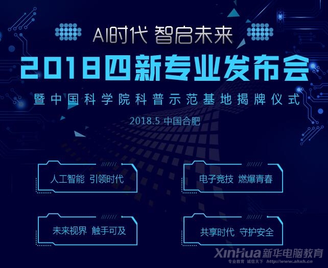 2018年5月17日,多名科技界、产业界、教育界著名学者、顶级专家和业界精英将汇聚创新之城中国·合肥,新华互联网科技将举办《AI时代 智启未来 2018新华互联网科技四“新”专业发布会暨中国科学院中国科普博览示范基地揭牌仪式》,该活动由新华互联网科技联合中国科学院共同举办,中国互联网协会和中国职业技术教育协会等专业协会指导,科大讯飞、华为、百度、直尚电竞等多家品牌企业参与,共同见证新华四大王牌“新”专业的发布,还将共同见证新华互联网科技正式揭牌成为中国科学院中国科普博览示范基地。