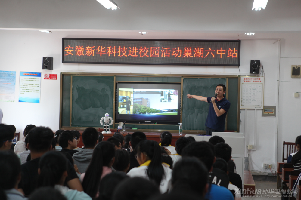 昨天下午,安徽新华科技进校园活动来到了巢湖六中,到达巢湖六中时已经是下午,看到在门口列队欢迎的老师同学们,安徽新华的工作人员们来不及休息,把准备好的爱心物资搬下车送给同学们。尤其是看到特地带来的高科技机器人,同学们都好奇不已,纷纷围着我们到场的老师,追问机器人的设计制造原理和操作方式,老师们也耐心的解答。全新的高配置电脑设备也深受老师同学的喜爱,待设备安装好之后,孩子们迫不及待的想来实际操作一下,一下子看到这么多高科技产品摆放在教室里,学校的老师同学们都兴奋不已,安徽新华的每一位参与老师的心情也是欣慰至极。