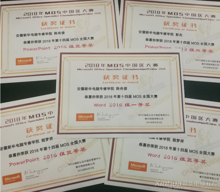 2018!六月的北京!捷报再传!2018年第十四届全国MOS总决赛,安徽新华学生软件本科1702班,陈传俊同学技压群雄,斩获MOS Word 2016组一等奖;软件C1702班彭杰同学,斩获MOS PPT 2013组二等奖;网络工程本科1702班程梦祥,斩获MOS PPT2016组以及MOS Word 2016组三等奖!这些同学用行动和实力展示了新华学子的专业素养和核心竞争力!