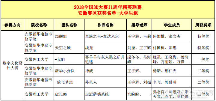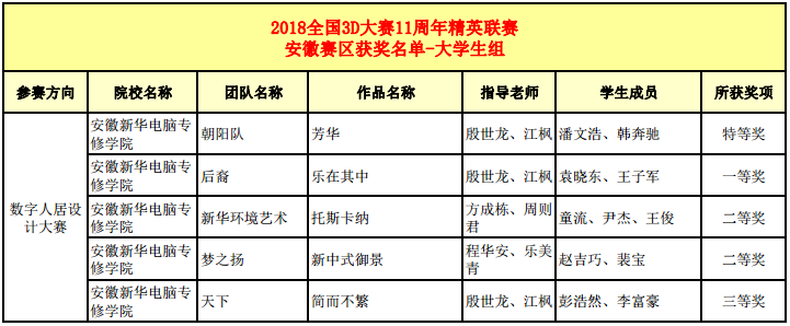 参赛作品水平不断提升,涌现出了一大批优秀设计作品与团队,并快速成长为行业新锐与翘楚, 备受业界关注。在刚刚结束的2018全国3D大赛11周年精英联赛中,安徽新华电脑专修学院动漫专业学生荣获安徽赛区2个特等奖、1个二等奖,安徽新华电脑专修学院环艺专业学生荣获1个特等奖、1个一等奖、 2个二等奖、 1个三等奖。