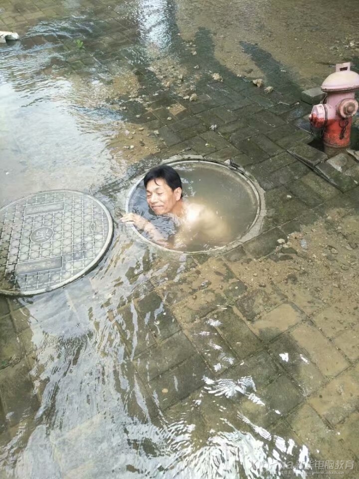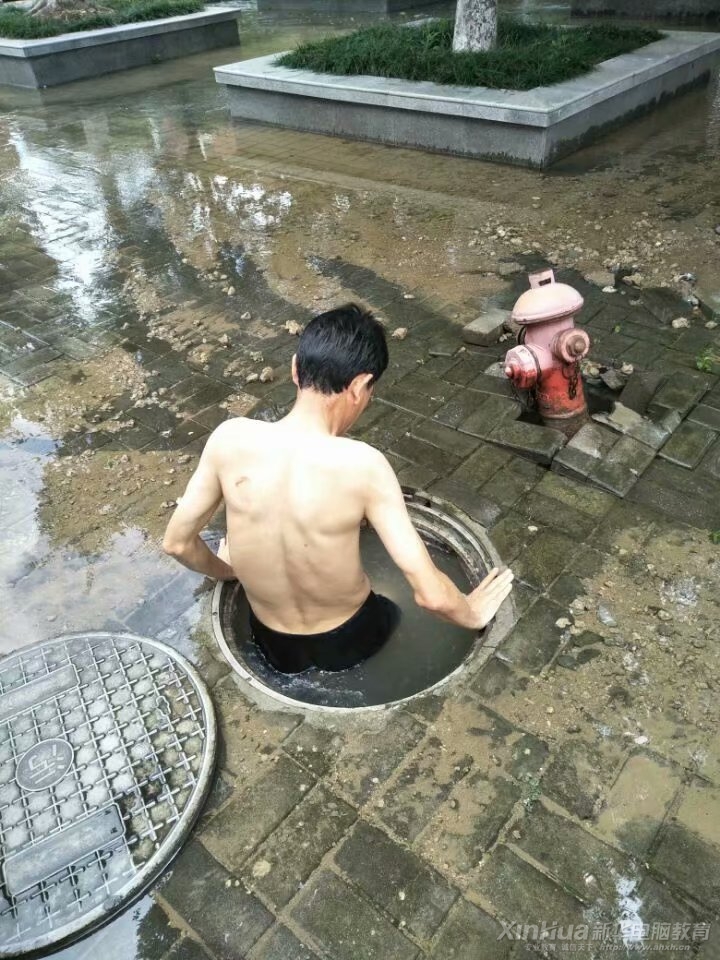 安徽新华电脑专修学院校园内突然水阀故障,一名后勤保障部职工只身跳下去抢修,水漫过了他的脖子,浑身湿透的他坚持修理。这一场景被人们记录了下来,获得了千万学子点赞。