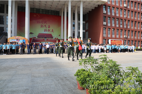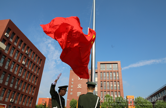 2018年9月3日星期一,全体师生集结到位,立于升旗杆下,庄严肃穆、紧张有序等待升旗仪式的开始。升旗仪仗队铿锵有力的走来,随着国歌的响起,五星红旗飘扬缓缓升入顶端,飘扬在空中,民族自豪之情在心中涌动。
