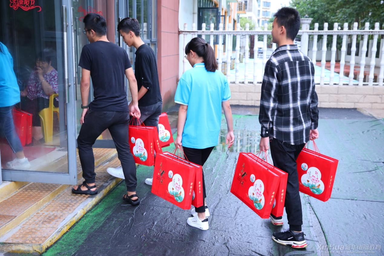 安徽新华电脑专修学院传递爱心一行人将中秋月饼交到老人手中,并为老人们送上节日的祝福。学子代表们还与老人聊天交流,了解他们的身体情况和生活状况,嘱咐老人们注意饮食健康与行动安全。
