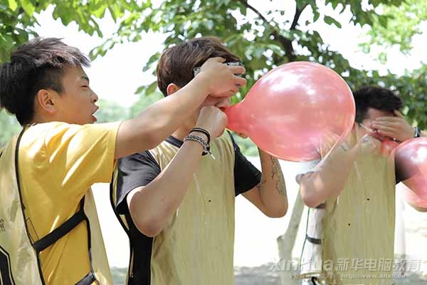 小伙伴们分为黄绿两队展开争夺大战。输的一方要接受惩罚:用嘴巴一点一点将气球吹爆。真的是很吓人的惩罚方式了。双方队长组织讨论分配任务,看哪位同学适合哪个游戏,各取所长,争取赢得最终的胜利。万万没想到绿队里的一位文静小女生这么会玩游戏,几个回合轻轻松松赢了黄队,黄队接受惩罚。