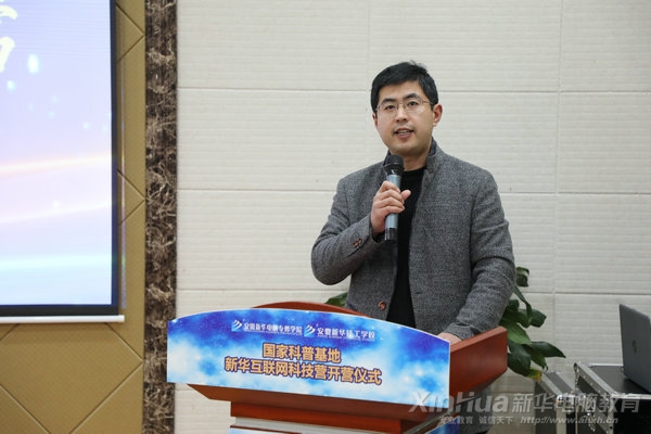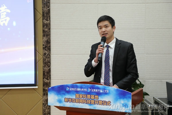 随后《科普新华》VCR播出,科技进校园、科技体验营、科技大咖讲座,2018科普新华收获满满,2019也将载誉前行。安徽新华电脑专修学院教务处主任上台讲话:说明科技体验营的意义,强调科技与教学的融入。