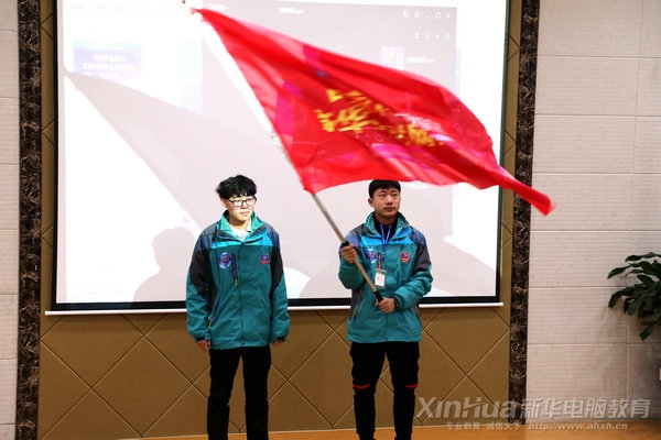 紧接着,2018届老生上台为2019届新生授旗,代表科技与人才的传承交接。最后,安徽新华电脑专修学院院长束凯钧与各嘉宾领导共同上台,启动科技体验营正式开营。