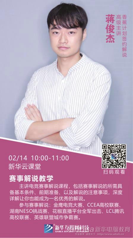 2019年2月14日,《新华云课堂》即将上线香蕉计划签约解说蒋俊杰老师,来为电竞学院的学子讲解:赛事解说教学。