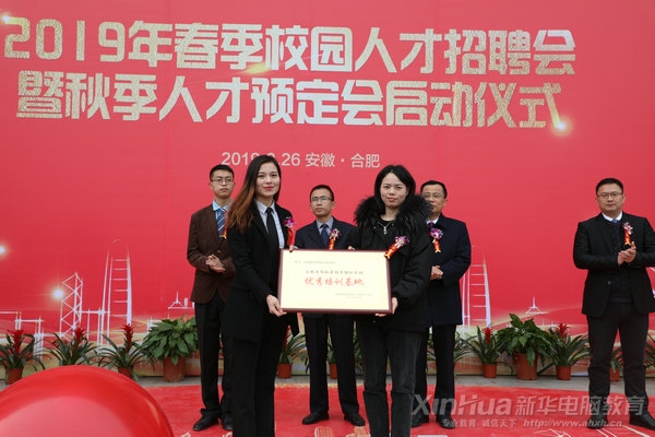 在慷慨激昂的开幕致辞之后,安徽省领航者创业实训项目办公室主任 吴倩为安徽新华电脑专修学院授牌,授予安徽新华《安徽省创业模拟实训优秀培训基地》 。