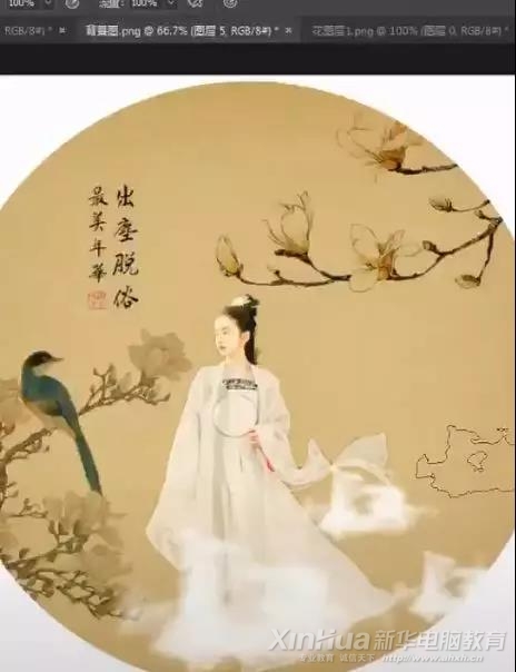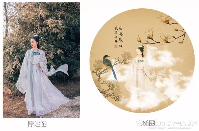 8、再把事先抠好的素材拖入,调整位置大小,最后使用云彩笔刷简单刷几笔,工笔画效果图就完成啦。