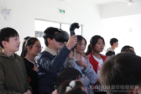 其中VR互动设备受到了学生的踊跃参与,动漫专业王莉老师生动有趣地向孩子们讲解了VR眼镜的操作方法、工作原理、VR技术的应用和机器人构造及技术,并介绍学生们体验是由安徽新华电脑学院师生共同开发的“捞金币”游戏。
