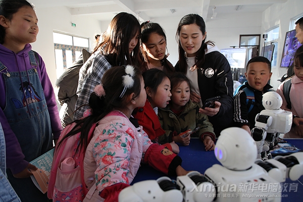 紧接着王老师为学生们现场操作机器人跳舞。机器人灵活多变,有趣搞怪的动作令孩子们大开眼界。