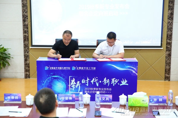 发布会的最后,2019年秋季新专业发布会暨名企定向班启动仪式正式开始,在场领导嘉宾先后上台,共同启动与见证了本次2019年秋季新专业发布会暨名企定向班的正式启动,并与安徽延达智能科技有限公司、2020跨境电商、合肥玖聚信息科技有限公司、新永安网络公司、安徽佐卡电子商务有限公司共同签订人才预定书。