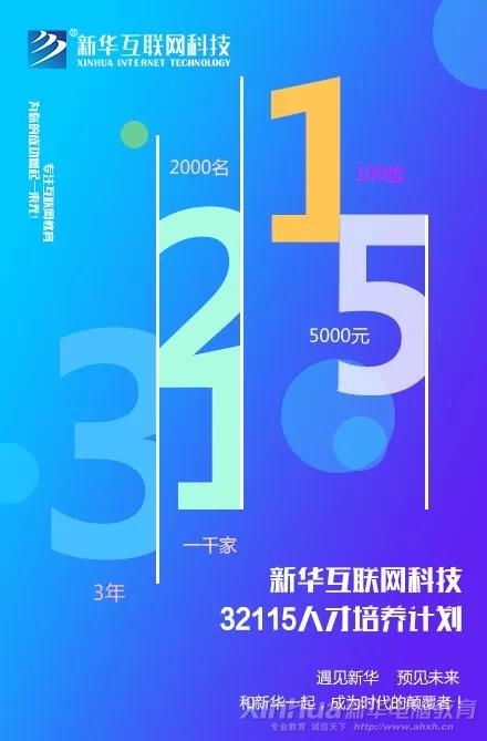 2019年,新华互联网科技全新提出“32115”人才培养计划,3年的在校学习时间,两千位纳入人才培养计划的学生,1千家优质合作企业、100名项目实训讲师、不低于五千的平均薪资,31年办学历程,与时俱进的教学模式,始终秉持爱与责任,用最利于学生发展的教育理念,为每一位学子保驾护航!