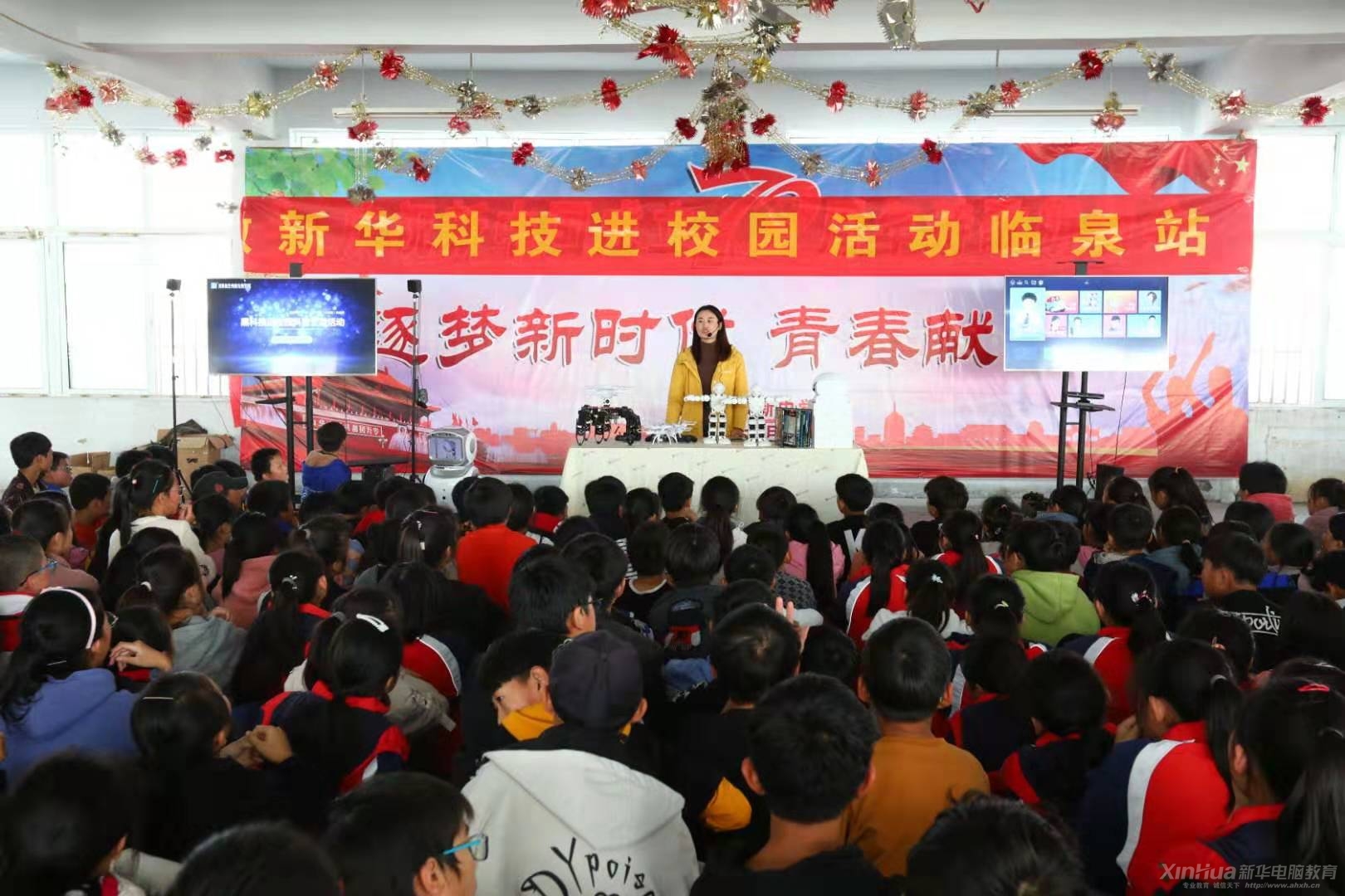 “科技进校园”走进临泉县杨新中学,带去了高科技机器人,向同学们展示最新的高科技产品。