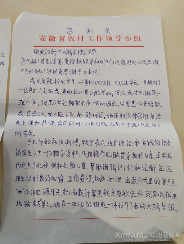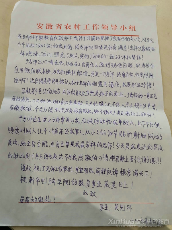 2019年12月3日,安徽新华电脑专修学院的于飞老师收到了一封特殊的信。整封信字迹工整、笔笔动情,是于飞老师的学生吴先环所写。