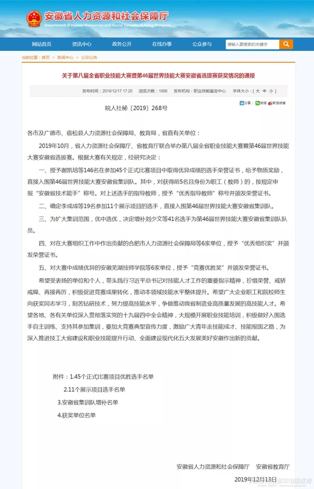 为备战第八届全省职业技能大赛暨第46届世界技能大赛,经全省选拔和比赛考核,安徽省人力资源和社会保障厅、安徽省教育厅日前确定,全省146名参加45个正式比赛项目并取得优异成绩的选手直接入围第46届世界技能大赛安徽省集训队!