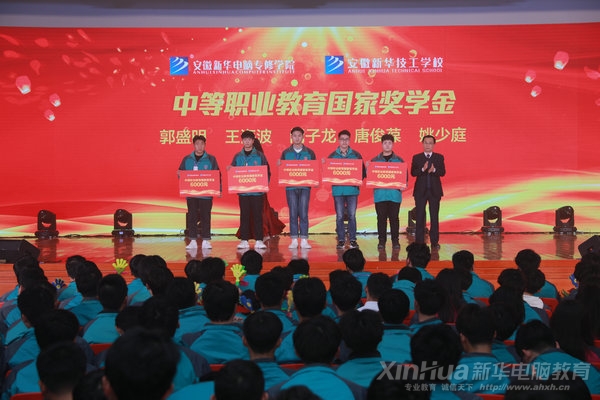 除了赛事获奖外,我院2019年多名学子还获得了国家奖学金及合肥市奖学金。其中郭盛明、王海波、闫子龙、唐俊葆、姚少庭5位同学获得了中等职业教育国家奖学金(以上同学每人奖励6000元),我院院长束凯钧为获奖同学颁奖。