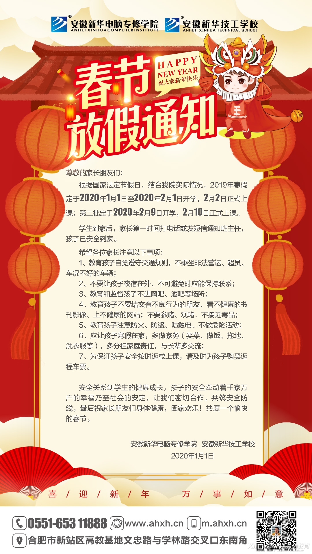 尊敬的家长朋友们,我院春节假期已经开始,为了保证学生放假安全, 现将放假时间及假期安全注意事项总结如下让我们密切合作,共筑安全防线,共度一个愉快的春节!