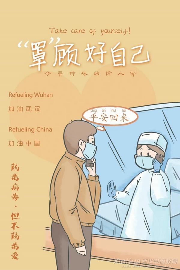 抗疫期间刚好是情人节,因此以这样的场景来创作。该作品讲述白衣天使冲在战“疫”前线上,想念家人,隔着窗户和家人打电话的情景,寓意着“隔离病毒,但不隔离爱”。