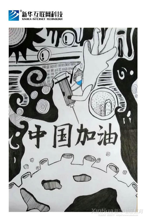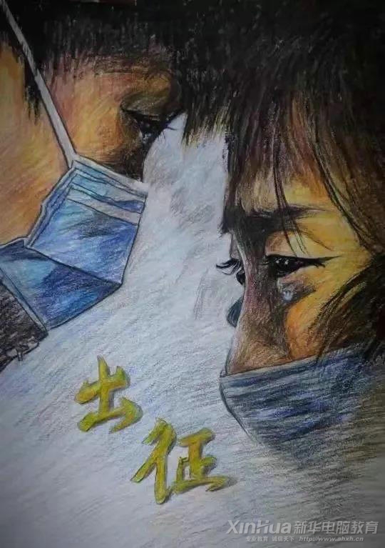整幅作品主要是以浅蓝色为主色调,意喻着美丽和洁净,象征着保护。疫情无情人有情,医护人员顾不得团圆,冒着生命危险前去武汉支援,他们是时代最美的“逆行者”,更是我们心中最可敬的时代英雄。