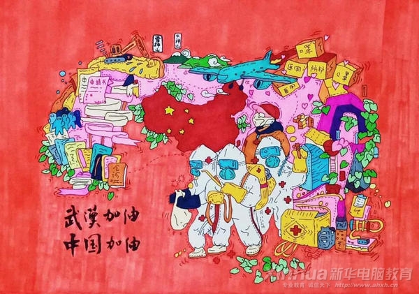 题材选取的中心思想为:所有人齐心协力万众一心,与病疫战斗到底。画面选择中国地图为中心点,用国旗的颜色和五角星代表国人在遇到困难时的团结一心。人物选择上,有一线防护人员和群众,他们带着口罩消毒、拿物资、记录、巡查。并通过医药包、飞机、挖掘机、医用物品等具有代表性的东西对画面进行装饰和串联,从而烘托出全国人民乃至全世界都在为“武汉加油!中国加油!”