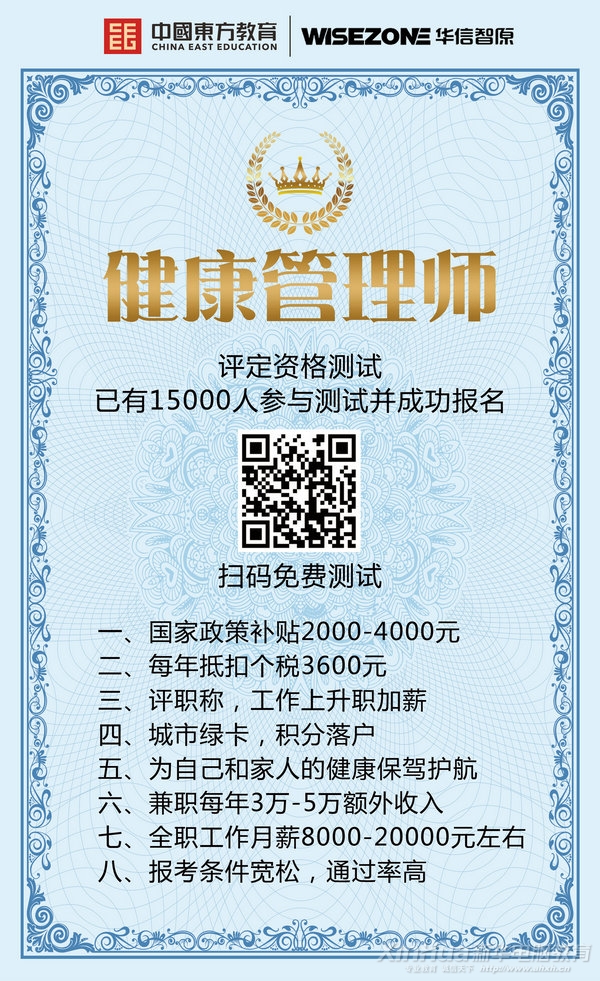 随着新医改的不断深入,“预防为主,防治结合”的医疗理念得到进一步推广。在2020年,国家将建成健康服务产业群规模达8万亿,2021年,全国健康养生服务领域将出现对专业人才的需求高峰。健康管理师已经成为健康产业最紧缺的复合型人才!