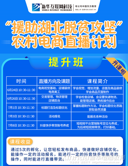 本次新华互联网科技-新华云课堂“援助湖北脱贫攻坚农村电商直播计划”,致力培养农村电商平台店铺管理人员。将分别从电商平台开通、店铺运营、店铺推广、流量变现、店铺平台、产品运营策划、直播带货、接单和综合项目实训方面入手。