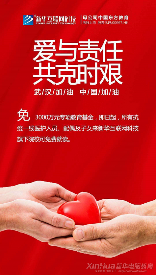 2020年1月30日,新华互联网科技母公司中国东方教育投入3100万元用于资助奋战在一线的广大医护工作者。其中,向安徽省红十字会捐赠人民币100万元,另设立3000万元的专项教育基金,凡参加2020年抗击新型冠状病毒的一线医护人员或其配偶、子女,报读新华互联网科技旗下任何区域院校、任何专业,费用全免。具体详情咨询当地新华互联网科技院校。