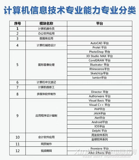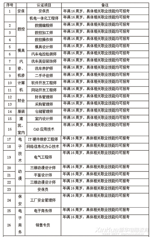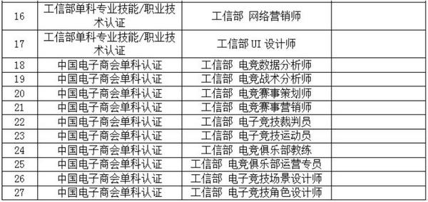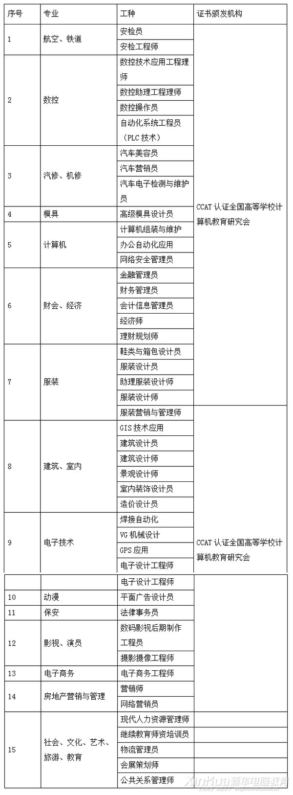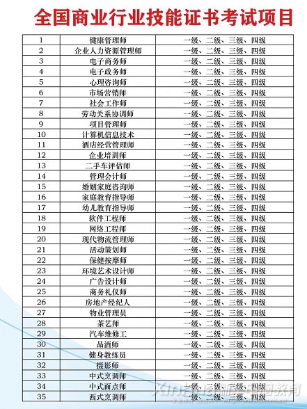 健康管理师、企业人力资源管理师、心理咨询师、二手车评估师、计算机方面、电子商务、影视动画等35个热门专业(每个证书都有四级、三级、二级、一级)。