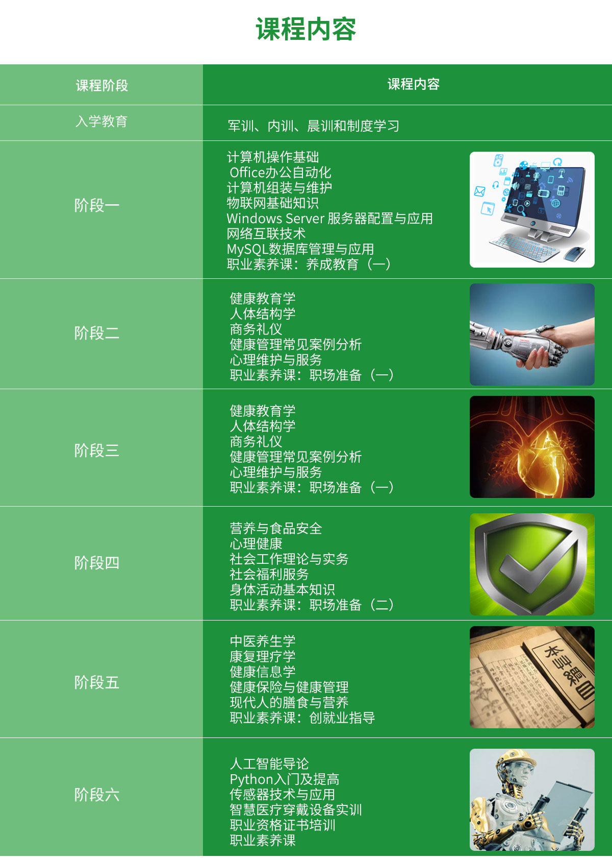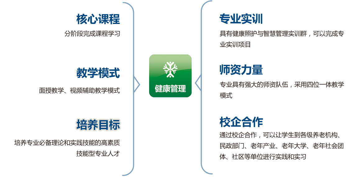教学模式,课程体系具有实用价值,智慧+健康教学模式,利用智慧医疗和健康管理相结合,利用智能设备和技术培养出智慧健康管理人才。
