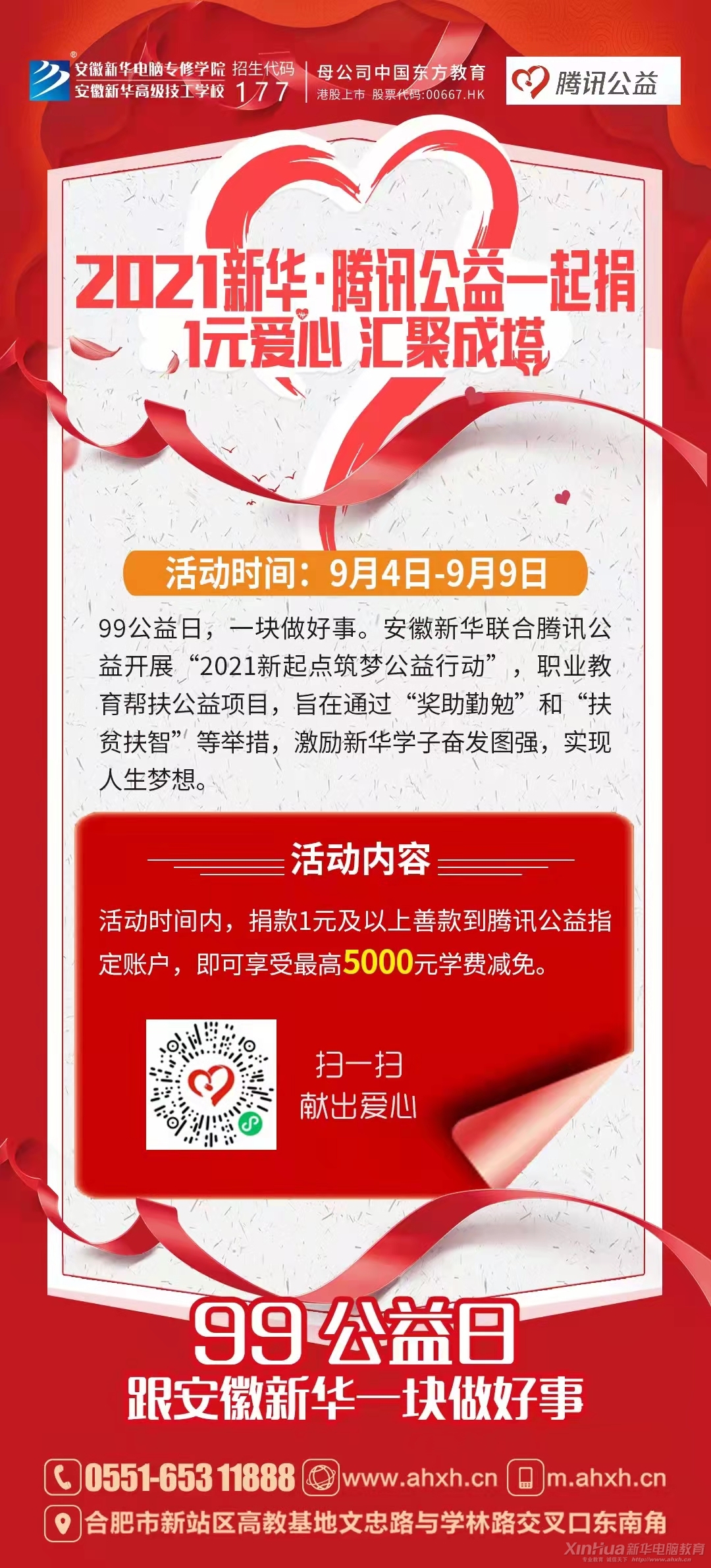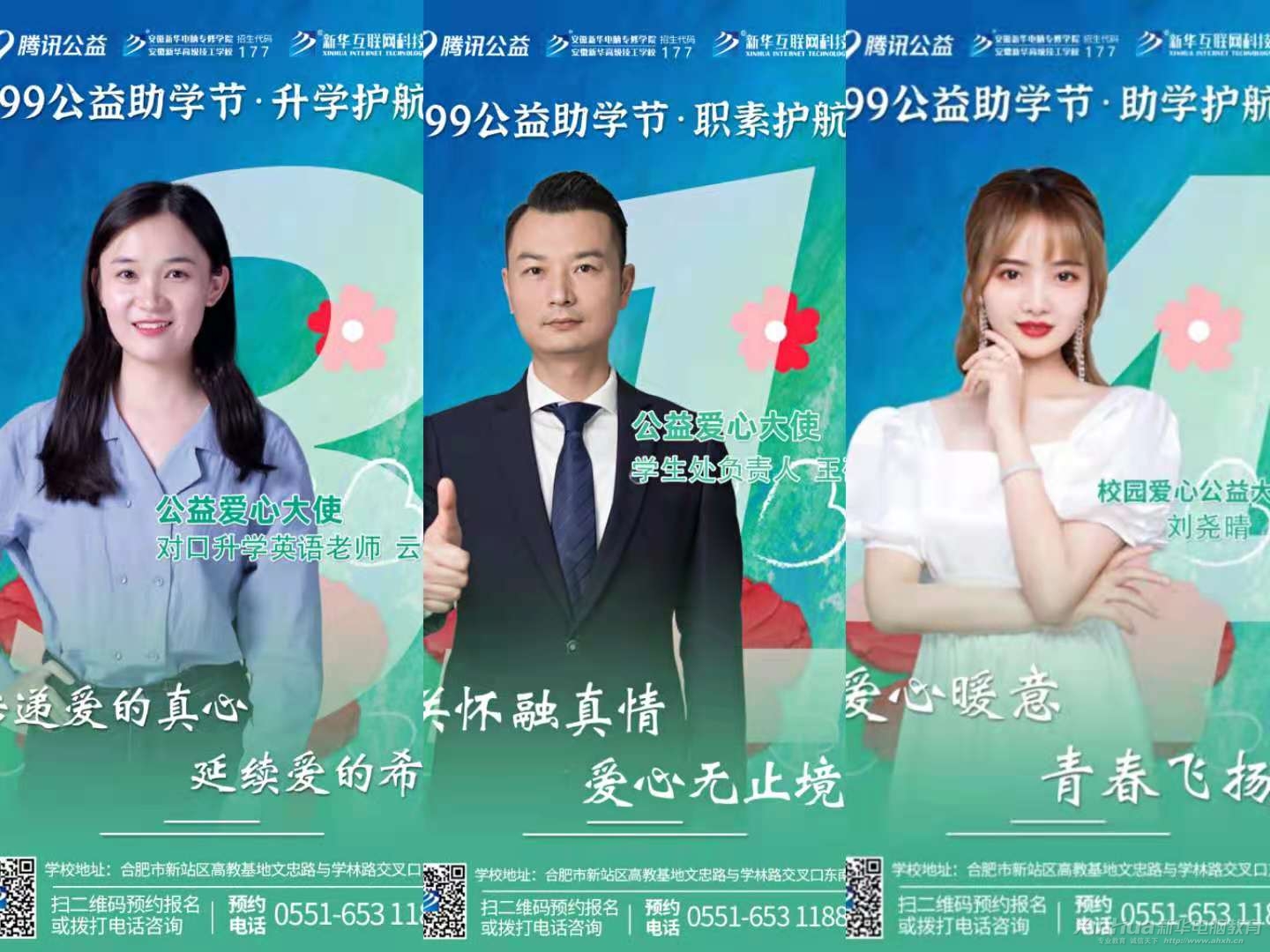 人人奉献一点爱,世界更美好。在99公益日到来之际,新华互联网科技全国30所院校将参与腾讯公益平台捐赠活动, 帮助所有待业青年、困难学子寻得求学机会,为学子们学习技术助力,为他们的家庭减轻负担。本次“新起点,筑梦公益行动”,以技术为杠杆撬动经济发展,以公益感召凝聚社会力量,助力梦想。新华互联网科技师生共同献力,截止今日已累计募捐三百多万,用点滴爱心为社会公益添彩。