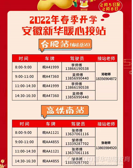 为来校新生、返校老生搭建一条平安便捷的直通车,安徽新华于合肥火车站、合肥南站安置了接站大巴车,并派遣接站老师现场等候,有需要的同学可以联系相关接站老师。