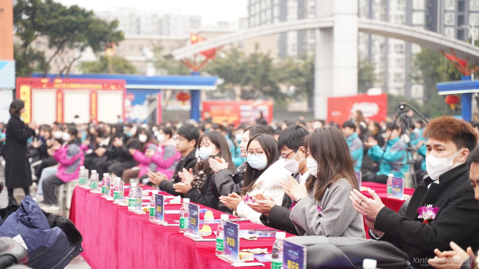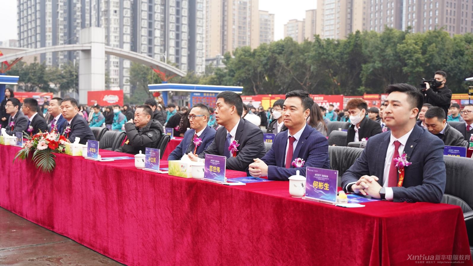 成都市就业服务管理局培训处处长龚辉、中国东方教育集团成都新华技工学校校长李宏海、中国东方教育东方海汇人力资源管理有限公司副总经理赵群、中国东方教育集团事业部总经理助理孙立民、京东西南分公司经理王彬合作企业代表以及众多领导嘉宾出席了本次启动仪式。今年前来招聘的企业数达120余家,带来1000余个对口工作岗位。