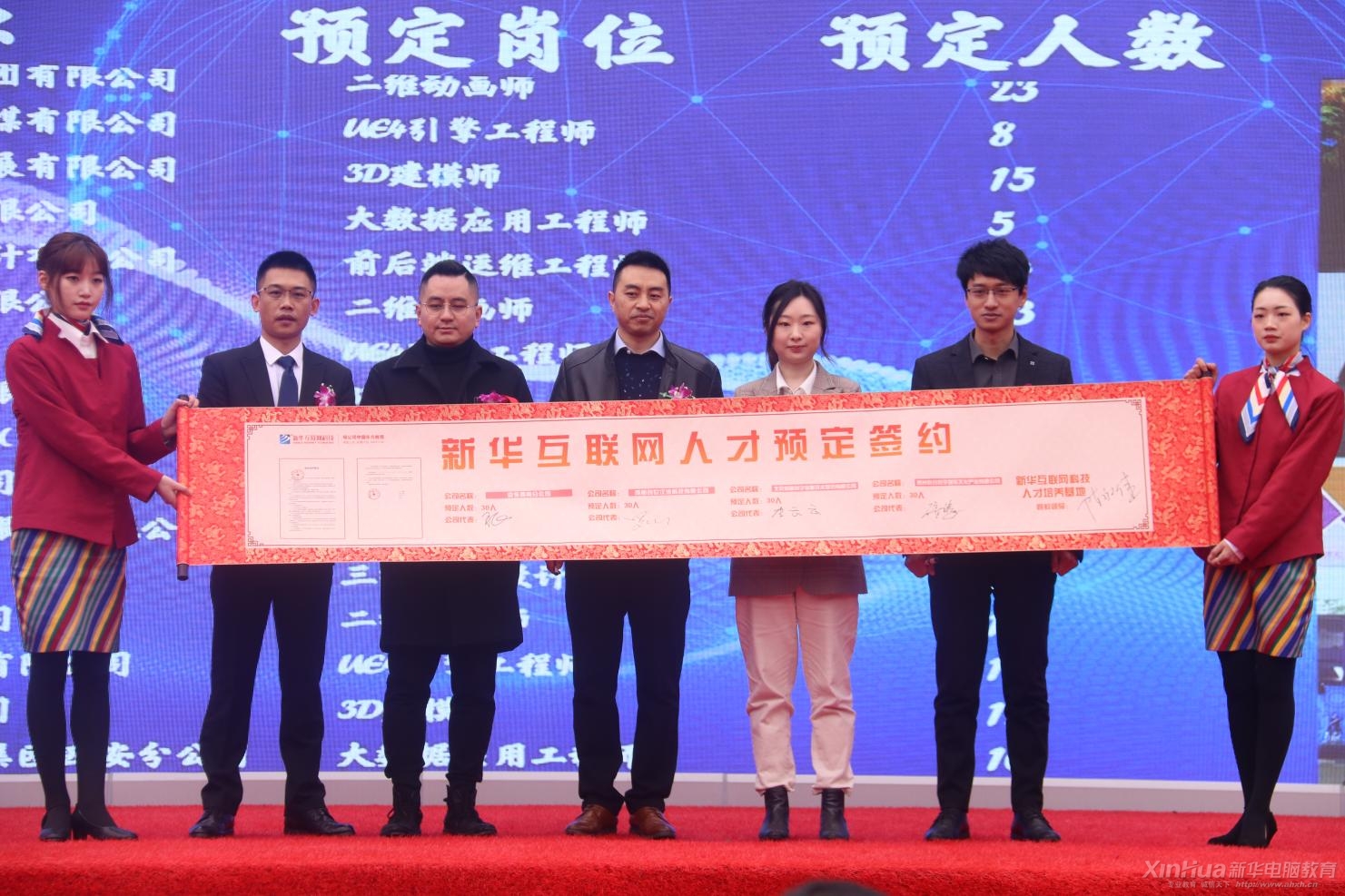 新华专场人才预定签约仪式在发布会现场,贵州豆豆优选科技有限公司、成都天锦印画网络科技有限公司、成都潮匠文化传媒有限公司、成都京店云电子商务有限公司、贵州数谷数字娱乐文化产业有限公司、北京知道创宇信息技术股份有限公司、成都创世汉沙科技有限公司、京东西南分公司8家企业与新华互联网科技现场签订人才预定协议,并且现场大屏幕实时滚动线上人才预定的百余家企业的预定需求。